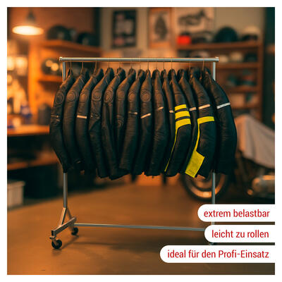 Die großen Belastung, die durch die Bewegung großer Textilmengen auftreten, werden durch die Bauart dieses Industrieständers mit Leichtigkeit gemeistert. Große ø 100 mm Gummirollen lassen ihn auch unter voller Belastung leicht verschieben. Durch die unteren Querstreben und dem dickwandigen Vierkantrohr hält der Lager-Rollständer problemlos bis zu 200 kg. Belastung aus und wird daher auch sehr gerne in der Textilindustrie oder der Textillogistik eingesetzt.