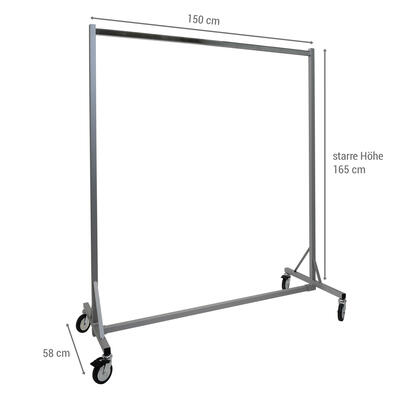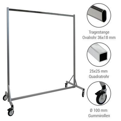 Die Konfektions-Tragestange wird bei diesem Industrieständer, im Gegensatz zu Standard-Rollständern, in den senkrechten Standrohren eingesteckt.