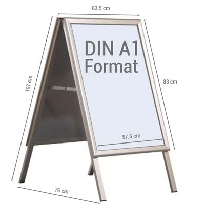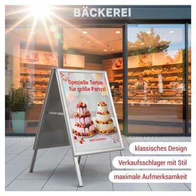 Der Kundenstopper Classic mit Gehrungsecken ist der Verkaufsschlager unter den Straßenaufstellern und überzeugt durch seine Vielseitigkeit im Innen- und Außenbereich. Ob vor Geschäften, Restaurants oder auf Messen – dieser Werbeaufsteller bietet eine zuverlässige Lösung für die Platzierung Ihrer Plakate.