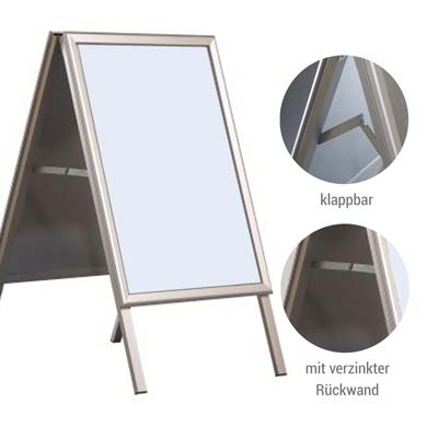 Kundenstopper mit Klappprofilen sind nicht wasserdicht. Zum Schutz Ihrer Papierplakate wird die Verwendung einer zusätzlichen Schutzfolientasche empfohlen. Passende Plakattaschen finden Sie in unserem Zubehör. Alternativ können Sie sich für einen Kundenstopper mit umlaufender Dichtung oder eine wasserdichten Schutzfolientasche entscheiden. Für den Einsatz im Außenbereich empfehlen wir eine wasserfeste Plakattasche (Artikel 111103).