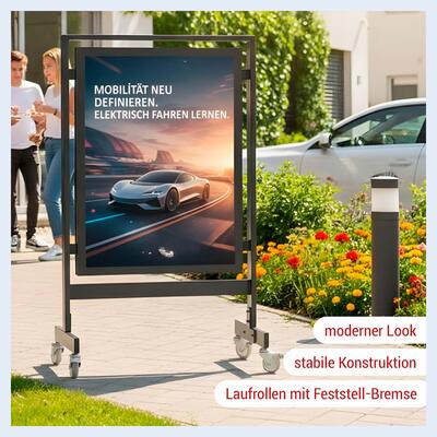 Der Kundenstopper Square ist die ideale Lösung für hochwertige Plakatwerbung im Innen- und Außenbereich. Mit seinem eleganten Design in granitgrau (RAL 7026) fügt er sich harmonisch in jede Umgebung ein und bietet gleichzeitig maximale Funktionalität.