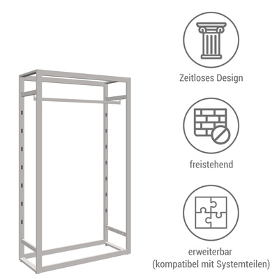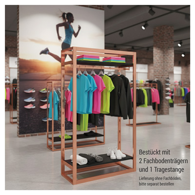 Freistehendes robustes Ladenbauregal Venezia. Bestückt mit 2 Fachbodenträgern & 1 Tragestange. Maße (HxT) 185 cm x 44,2 cm. in den Breiten 107,2 cm und 67,2 cm. Erhältlich in Chrom oder allen RAL-Farben. Endlos erweiterbar!
