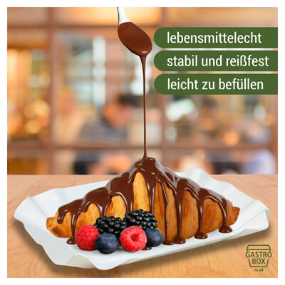Unsere weißen Pappschalen sind ideal für Crêpes, Waffeln, Churros oder andere Imbissklassiker. Durch ihre handliche Größe eignen sie sich besonders gut für kleinere Portionen und Snacks. Perfekt für Dessertstände, Foodtrucks, Jahrmärkte oder Catering – die hygienische und umweltfreundliche Lösung für den To-Go-Bereich.