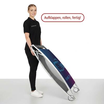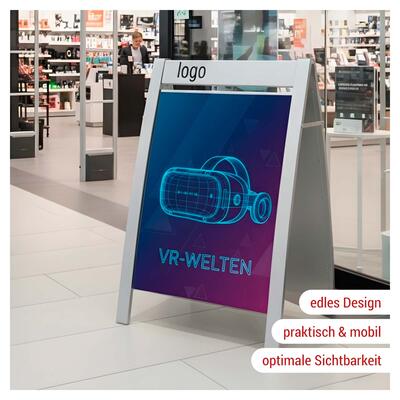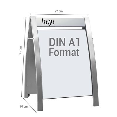 Der Plakatständer Boston II ist die elegante Lösung für professionelle Außenwerbung. Mit seinem hochwertigen Stahlrahmen und der robusten Pulverbeschichtung überzeugt er durch Stabilität und modernes Erscheinungsbild. Das integrierte Topschild bietet zusätzlichen Raum für Logos oder Botschaften und macht den Kundenstopper zum echten Blickfang.
