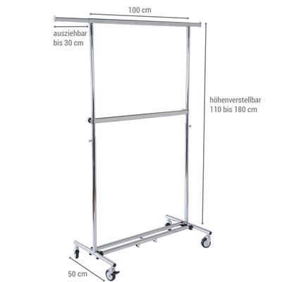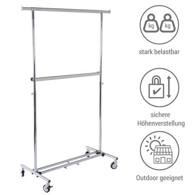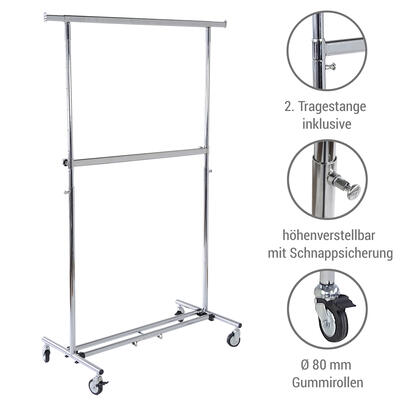 Der Konfektionsständer für den mobilen Einsatz ist aus stabilem Ø 25 mm Rundrohr gefertigt und hochglänzend verchromt. Die Höhenverstellung vom 90 bis 180 cm erfolgt durch ein Schnappsystem, wodurch die eingestellte sicher fixiert ist. Beide Seitenteile des Rollständers werden mittels Scharniere nach innen geklappt. Der Rollständer ist mit vier Ø 80 mm großen Gummirollen, von denen zwei mit einer Feststellbremse ausgestattet sind. Die Kopfstange des Reiserollständers hat rechts und links jeweils 30 cm lange Auszieharme. Die zum Lieferumfang gehörende zweite Tragestange verdoppelt die Abhängefläche des Ständers.