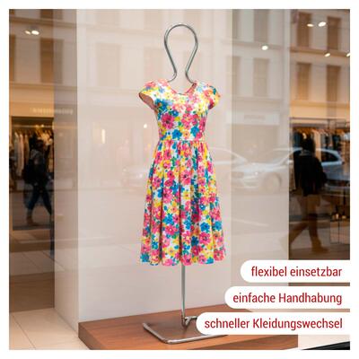 Diese Rohrfigur besteht aus zwei Teilen, die einfach ineinander gesteckt werden. Das minimalistische Design verzichtet bewusst auf Arme und Beine, wodurch Kleidungsstücke besonders schnell dekoriert und gewechselt werden können. Dank des geringen Gewichts lässt sich die Figur mühelos umpositionieren – ideal für den flexiblen Einsatz im Schaufenster oder auf der Verkaufsfläche.