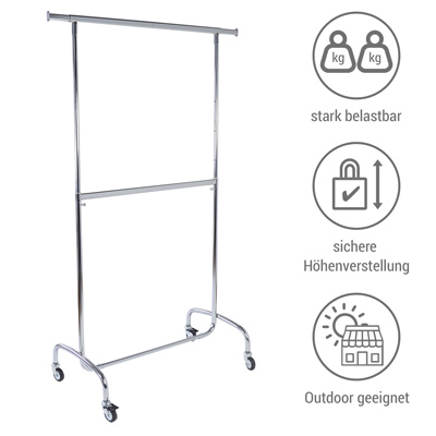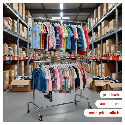 Der robuste Konfektionsständer mit doppelter Tragestange maximiert Ihre Verkaufsfläche – ideal für Textilhandel und Außeneinsatz. Das Ø 28 mm Rundrohr-Gestell mit verschweißten Verbindungen garantiert höchste Belastbarkeit.