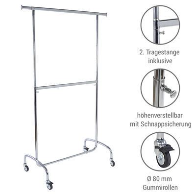 Die zweite Tragestange lässt sich stufenlos in der Höhe fixieren – für doppelte Warenkapazität. Zwei ausziehbare 30-cm-Seitenarme bieten zusätzlichen Platz. Vier Ø 80 mm Gummirollen (zwei mit Feststellbremse) ermöglichen sicheren Transport auch im Außenbereich. Click-Verschluss der unteren Querstange verhindert ungewolltes Lösen.