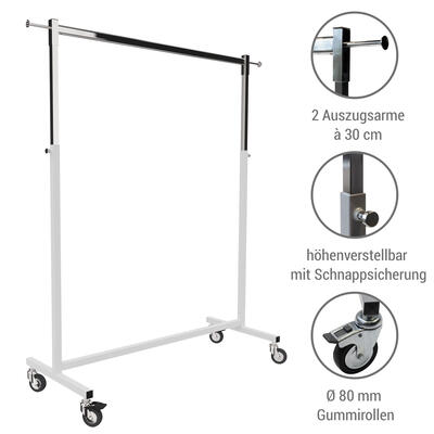 Seitlich sind die Rollständer Sina mit zwei 30 cm lange Auszugsarme ausgestattet. Dieses bietet weiteren viel Platz für Ihre Waren.