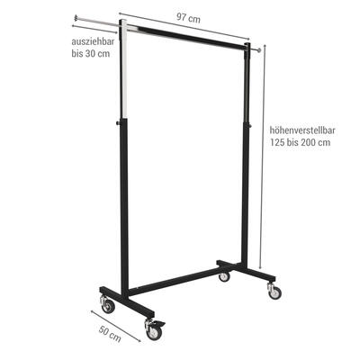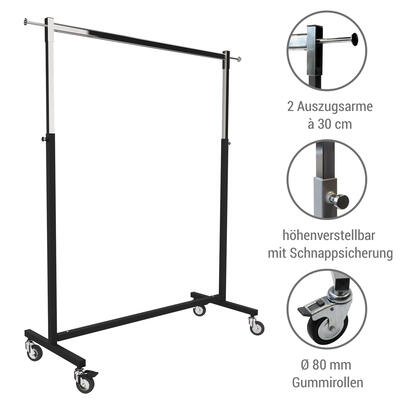 Die Höhenverstellung von 125 bis 200 cm erfolgt per Schnappsystem in mehreren Stufen. Zwei ausziehbare 30-cm-Arme bieten zusätzlichen Platz für Accessoires. Vier gummierte Ø 80 mm Rollen (zwei mit Feststellbremse) ermöglichen müheloses Verschieben zwischen Lager und Verkaufsraum.