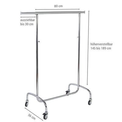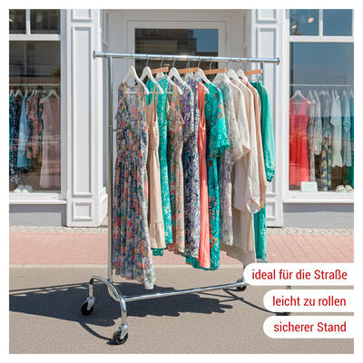 Die Höhe lässt sich werkzeuglos in 10-cm-Schritten von 148 bis 200 cm anpassen. Zwei seitliche Auszugsarme à 30 cm bieten zusätzliche Hängefläche. Der Ständer ist in vier Teile zerlegbar und somit leicht zu transportieren und zu lagern. Mit Ø 80 mm Gummirollen (zwei feststellbar) bleibt er mobil und standsicher – auch im Außenbereich.