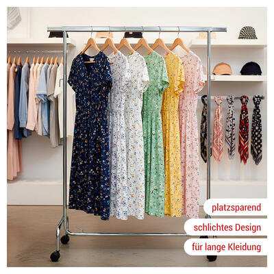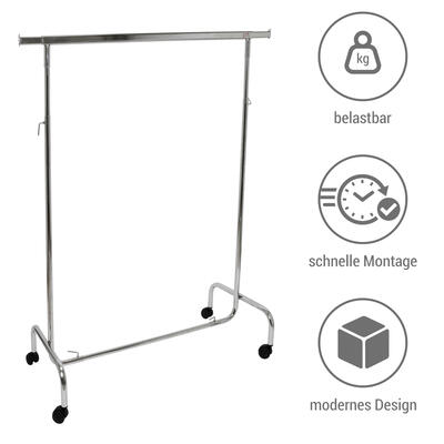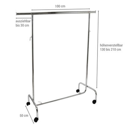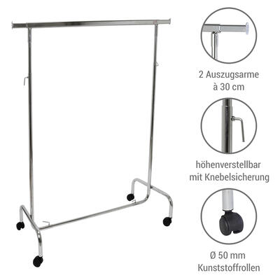 Der Rollständer Simply II ist ein hochwertiger Konfektionsständer für den professionellen Einsatz in Boutiquen, Läden und Showrooms. Gefertigt aus Ø 25 mm verchromtem Rundrohr und 100 cm breit, bietet er optimale Stabilität bei kompakter Bauweise. Mit zwei seitlichen Auszugsarmen x 30 cm gewinnen Sie zusätzliche Präsentationsfläche für Kleidung, Kollektionen und Accessoires.