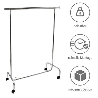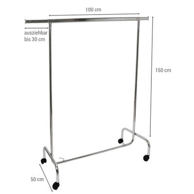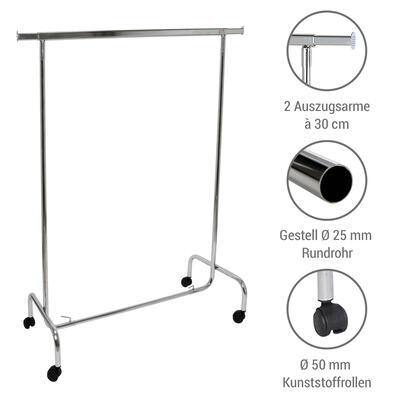 Rollständer Simply, mit allem ausgestattet, was ein Rollständer benötigt. Hergestellt aus Ø 25 mm verchromtem Rundrohr, 100 cm breit und 150 cm hoch, ausgerüstet mit Ø 50 mm Kunststoffrollen für den Indoorbereich und seitlichen Auszugsstangen.