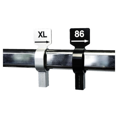 Weiter führen wir Größenkennzeichnungen wie Ringscheiben, Stangenreiter, Größenscheiben sowie Größenkennzeichnungen für Holz- und Glasböden. Ebenso führen wir Bügelclips, Größenkennzeichnungen und Zahlenreiter für die Kennzeichnung direkt am Aufhängehaken der Kleiderbügel.