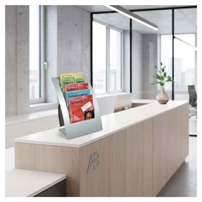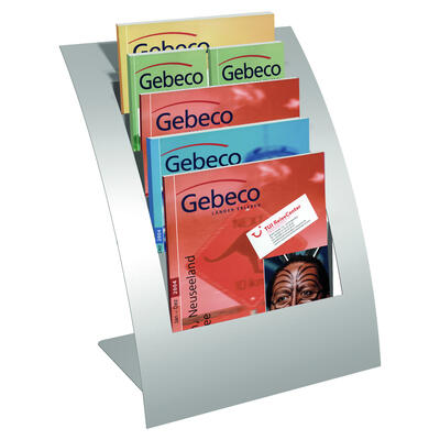 Ausführung: Tischmodell Format: 5 Fächer in DIN A4 Material: Metall Einsatzbereich: Theke, Empfang, Verkauf, Information Stellform: Mehrfach-Prospekthalter für Tischflächen