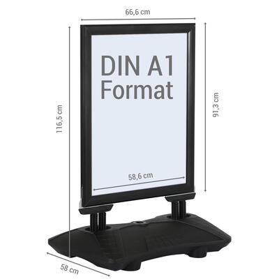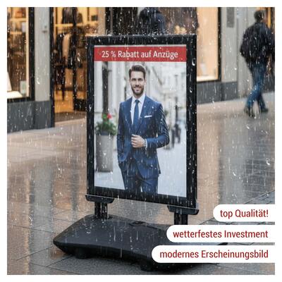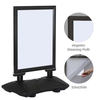 Die integrierten Laufrollen machen den WindPro mobil und flexibel einsetzbar. Der doppelseitige Klapprahmen in elegantem Schwarz ermöglicht einen schnellen Plakatwechsel und setzt Ihre Werbung beidseitig perfekt in Szene.